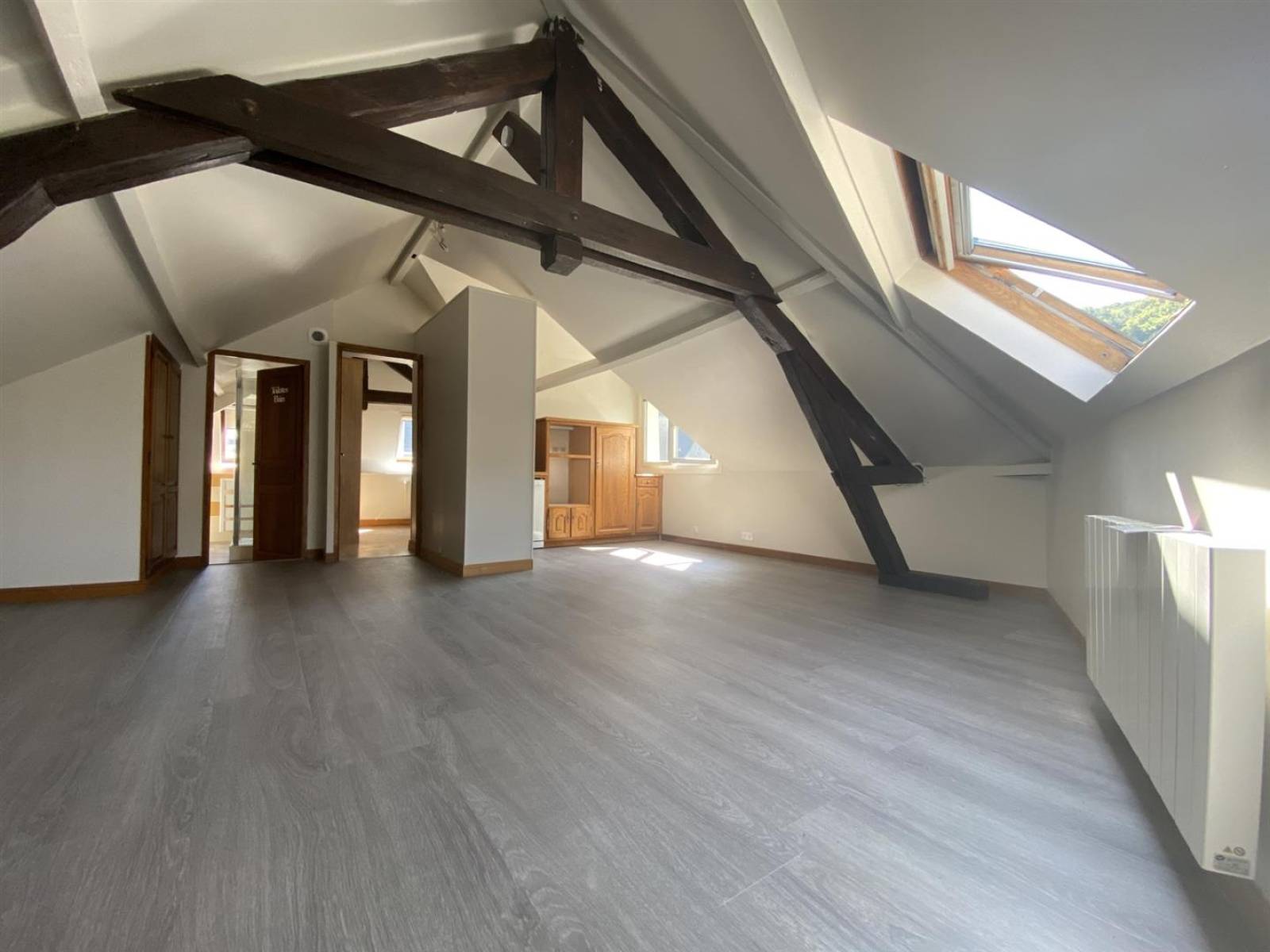Apt comprenant une VASTE pièce de vie 40m² avec une cuisine aménagée-équipée ouverte sur un LUMINEUX séjour-salon, une chambre, une salle de douche, un wc, un local à vélo.
